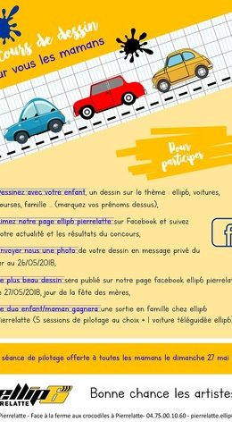 Pour participer, il suffit de faire un dessin sur le thème ellip6, voitures, course, famille ..., d’aimer notre page facebook ellip6 Pierrelatte, de poster votre dessin en mp.